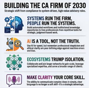 But perhaps this moment is not a threat; it is a signal. The CA firm of 2030 will not be defined by the number of audits or compliances performed but by the quality of insight, the sophistication of systems, and the breadth of services it delivers. The redesign of our profession begins now, not in 2030.