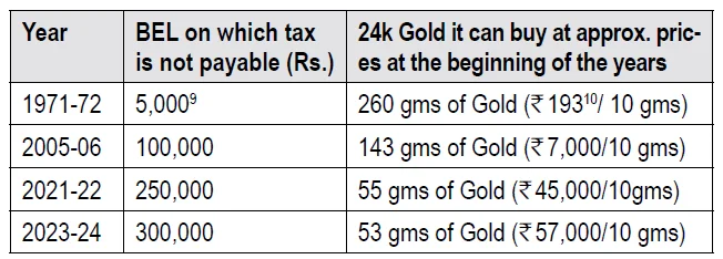 g) What is beating down the taxpayer in achieving his goal: Inflation and tax obligation defeat the citizen’s aspirations given in (e) above. Therefore, one cannot talk of taxes without inflation. Normally one can compare rise in basic exemption limit by comparing it with inflation indices. But for a moment I wish to present the ‘gold standard’ on how even the Basic Exemption Limit (BEL) furthers this beating of taxpayer: